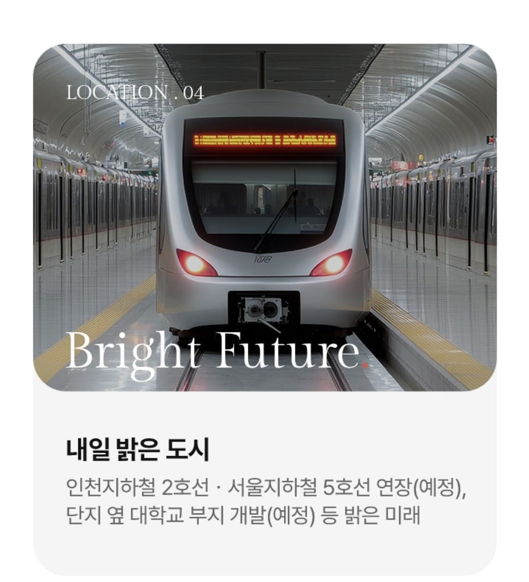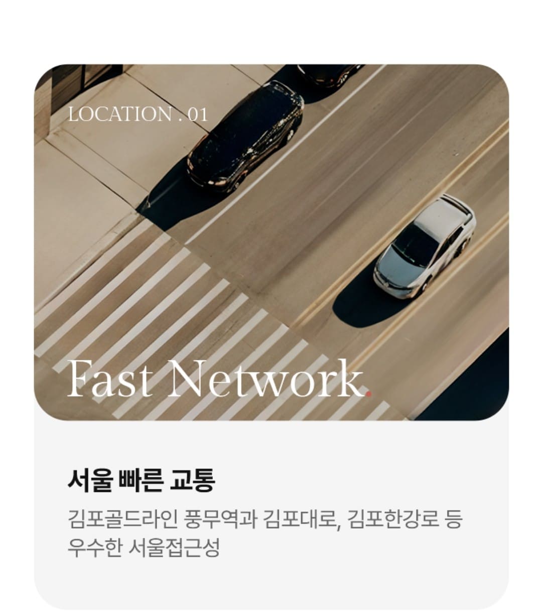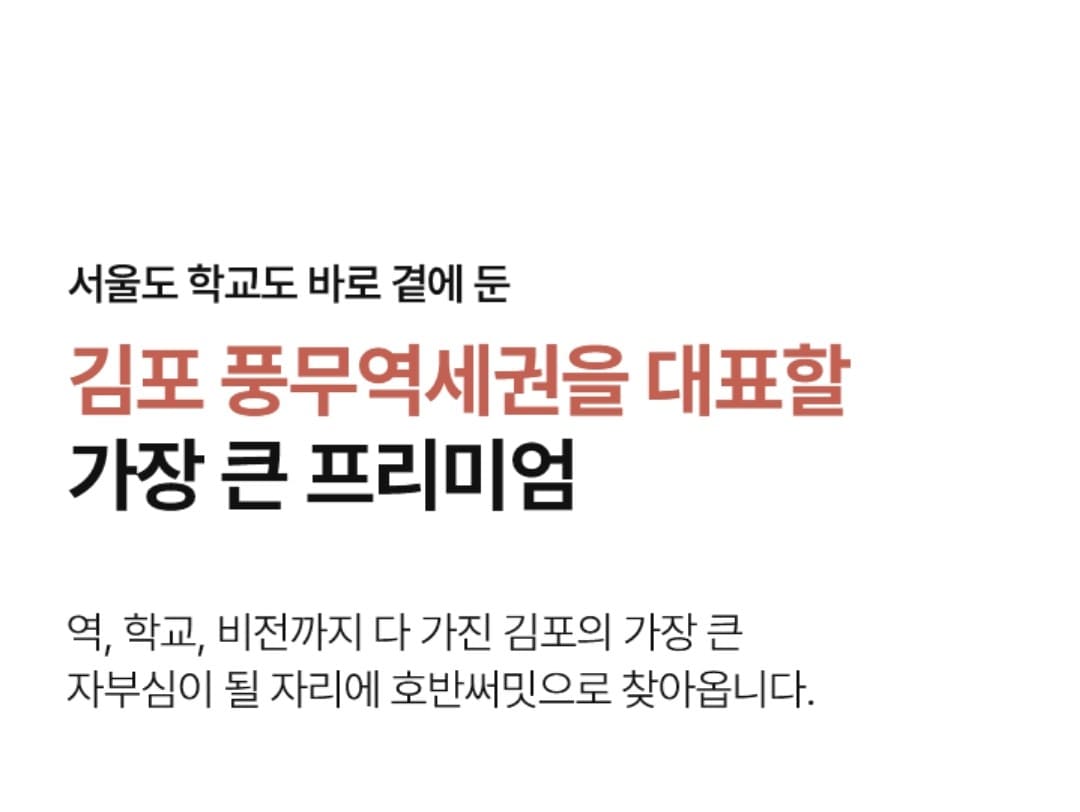 단지는 도보 거리에 위치한 김포골드라인 풍무역 역세권 입지를 갖춰 교통편의성도 뛰어납니다. 특히 풍무역에는 서울5호선 연장선(예정)이 정차할 예정이고, 인근에는 GTX-D노선(추진)의 노선이 계획돼 교통편의성은 더욱 확대될 것으로 기대됩니다.